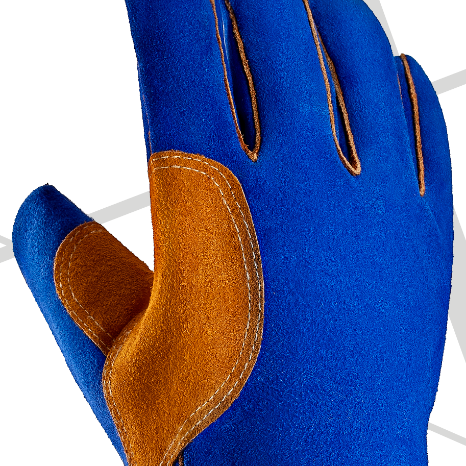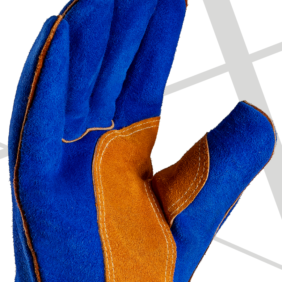 Guante de seguridad de piel, con refuerzo de piel en la palma y entre el índice y el pulgar, forrado con tejido de fibra natural y espuma en la palma, los dedos y el dorso de la mano, y forrado con tejido de fibra natural y sintética en la muñeca. Costuras reforzadas con hilo de aramida. Puño de 41 cm (16 pulgadas).